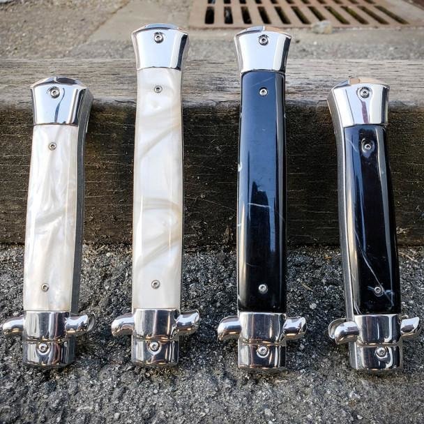 There is no doubt that the OTF Marbled Stiletto Automatic Knife will make a bold statement, coming in at 9″ or 11″ in overall length. The stiletto knife has a mirror-polished, 3 3/4″ stainless steel blade with a razor-sharp blade edge and a penetrating point. The blade snaps out of the front of the knife when the slide trigger is pushed forward and retracts when pulled back. The 4″ or 5″ closed pocket knife features classic handle scales, and the slide trigger is conveniently located on top.The impressive stiletto pocket can be carried securely in a nylon belt holster with a quick release buckle.